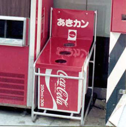 | 霧ヶ峰での実験後、急増する飲料自販機の散乱ゴミ対策として、当初は矢印マーク付コレクタを試験的に設置しました。 しかし、異物混入等の問題から専用器具の必要性が高まり、最初の自販機専用の空き缶回収容器『NA-23』が誕生します。金属製で、パイプフレームに蓋をつけ飲料缶の梱包段ボールを再利用して2個並べて収納できるデザインのものでした。 その後、自販機の数量増加に伴い必要数も格段に増え、より安価で量産性に優れた製品が求められるようになり、樹脂製回収容器第一号『NHP-1』が開発されました。さらに、それに続く『NHP-200』によって全国的に普及しました。その後、さまざまな機能面の改善、経済効率の追求によるデザインの変更、モデルチェンジを繰り返しますが、丸穴の専用投入口を備えた縦長の全体の意匠、マグネットなどを使用した自販機への固定方法などは、この用途の製品のスタンダードとなり現在でも踏襲されています。 |