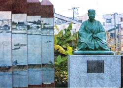 都営地下鉄新宿線・大江戸線の森下駅から歩いて約十分。石階段を上り分館の小公園に着くと、座布団に座った姿勢のブロンズ像がこちら向きに出迎えた。芭蕉の門弟・杉山杉風(さんぷう)が描いた絵を立体化し、高さ約1.2メートルで、台座(約1.2メートル)に乗っている。1995年4月に完成した。